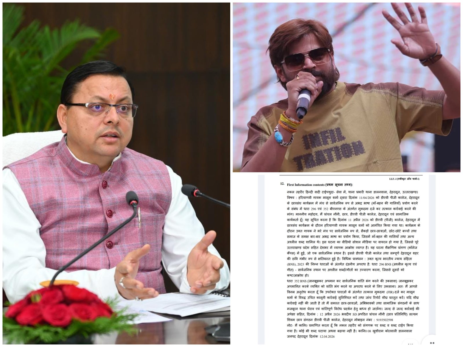 मिली जानकारी के अनुसार, छात्र प्रतिनिधि प्रांचल नौनी (सत्यम शिवम छात्र संगठन, डीएवी पीजी कॉलेज) द्वारा 12 अप्रैल 2026 को थाना डालनवाला में एक लिखित प्रार्थना पत्र दिया गया। शिकायत में आरोप लगाया गया कि 11 अप्रैल 2026 को आयोजित कार्यक्रम के दौरान गायक मासूम शर्मा ने सार्वजनिक मंच से आपत्तिजनक भाषा का प्रयोग किया, जिससे वहां मौजूद छात्र-छात्राओं और आम जनता की भावनाएं आहत हुईं।