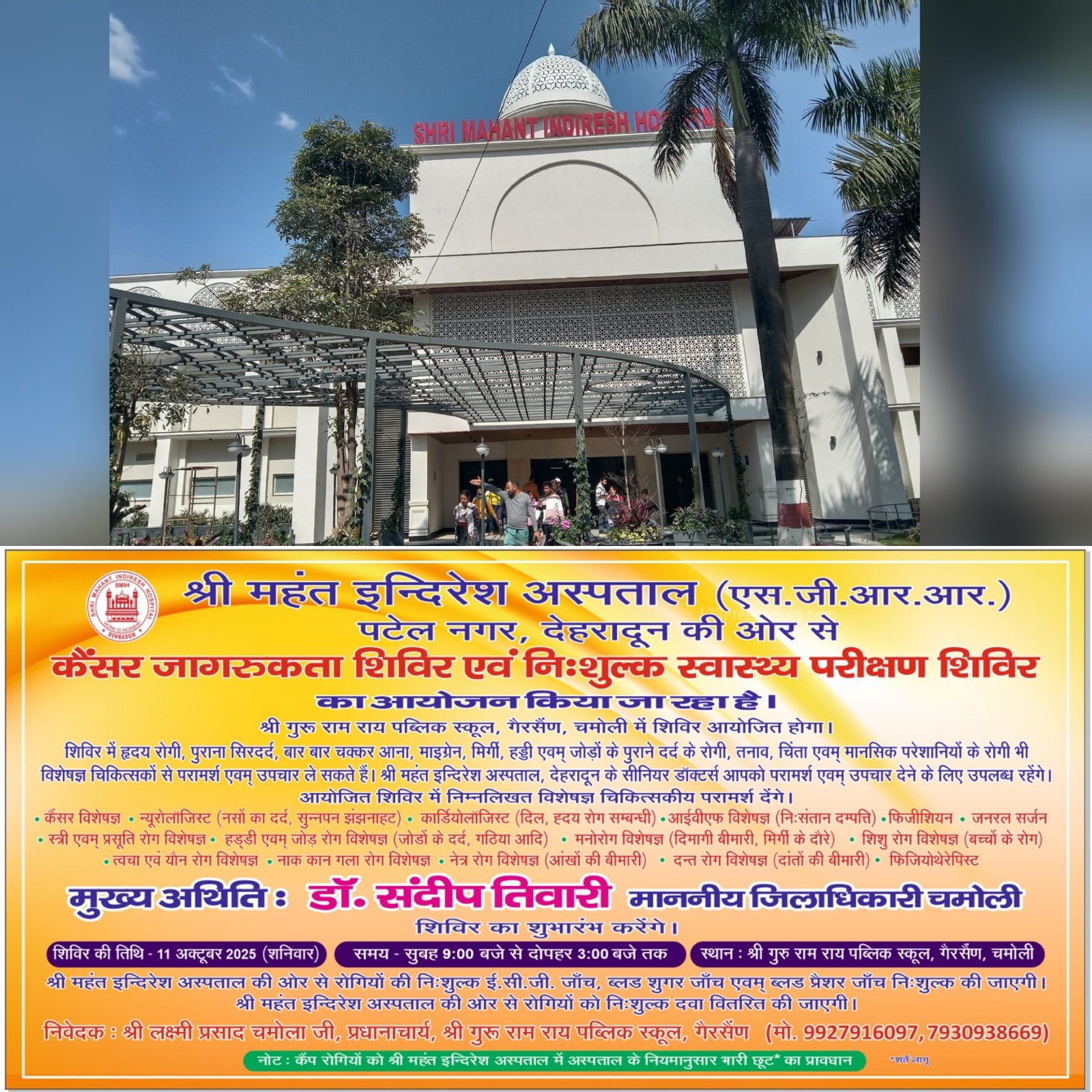 श्री गुरु राम राय एजुकेशन मिशन/ विश्वविद्यालय / मेडिकल कॉलेज और उसके अंतर्गत संचालित श्री महंत इन्दिरेश अस्पताल, देहरादून द्वारा — सरकार के सहयोगी संस्थान के रूप में — गैरसैंण में निःशुल्क स्वास्थ्य एवं कैंसर जागरूकता शिविर का आयोजन किया जा रहा है।